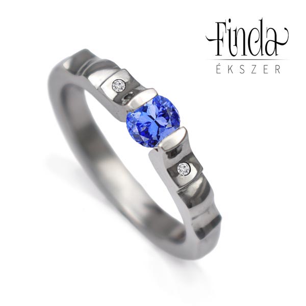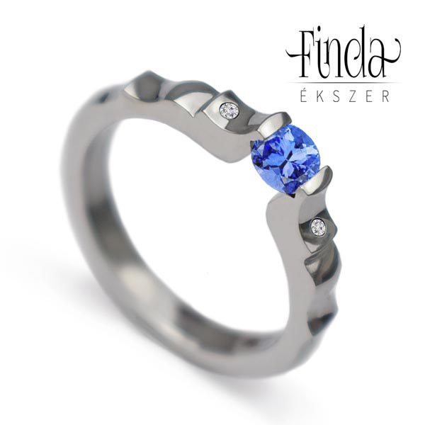 A központi kék zafír drágakövet a nemesacélban rejlő feszültség tartja stabilan a helyén, a gyűrű vállaiba egy-egy gyémánt briliáns került.