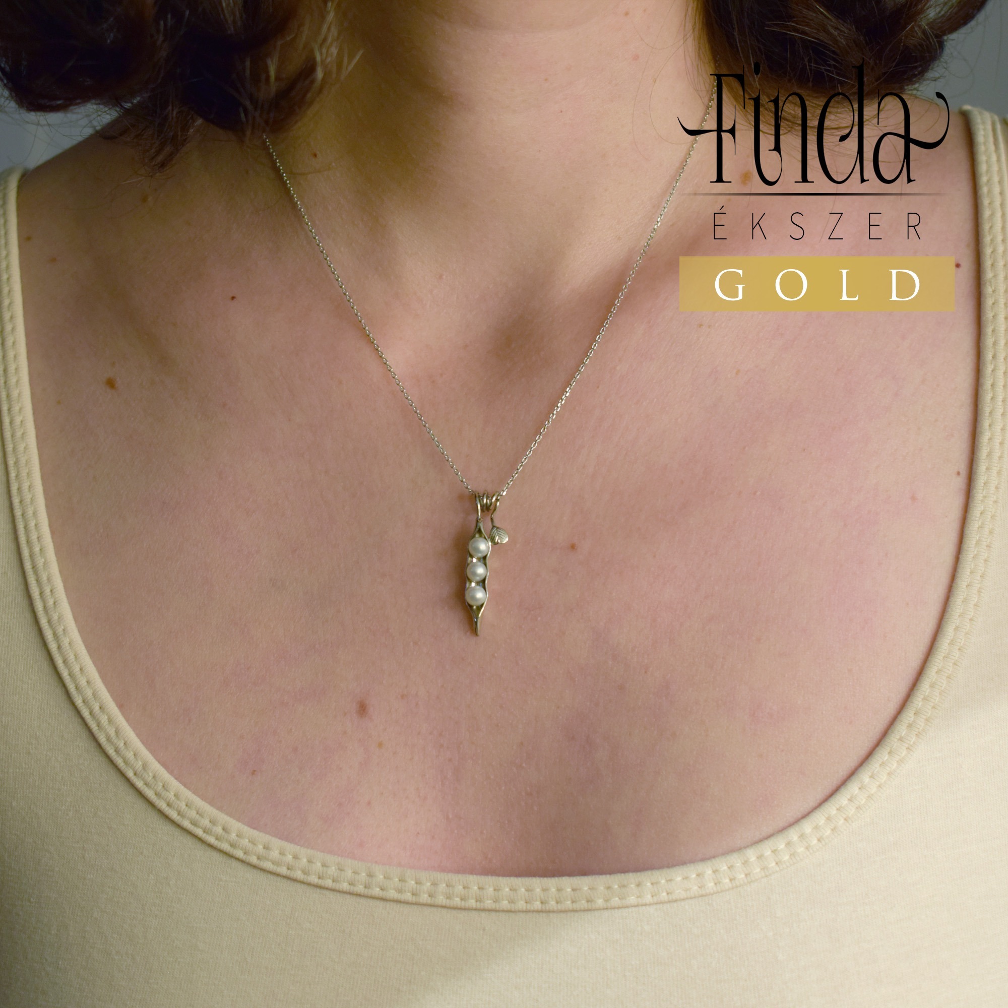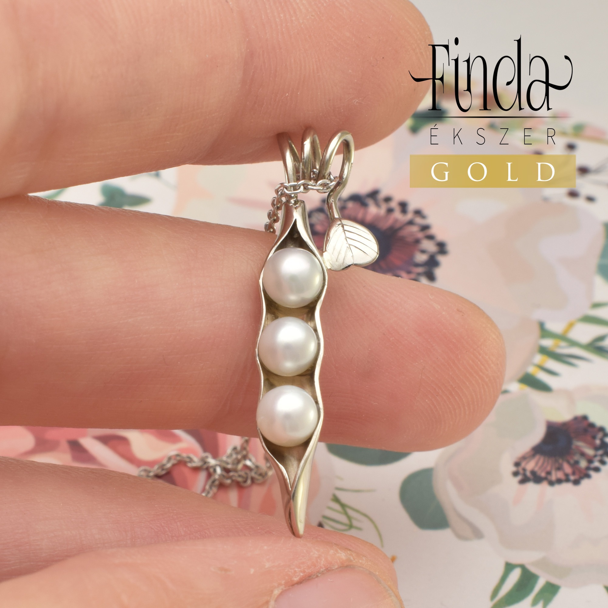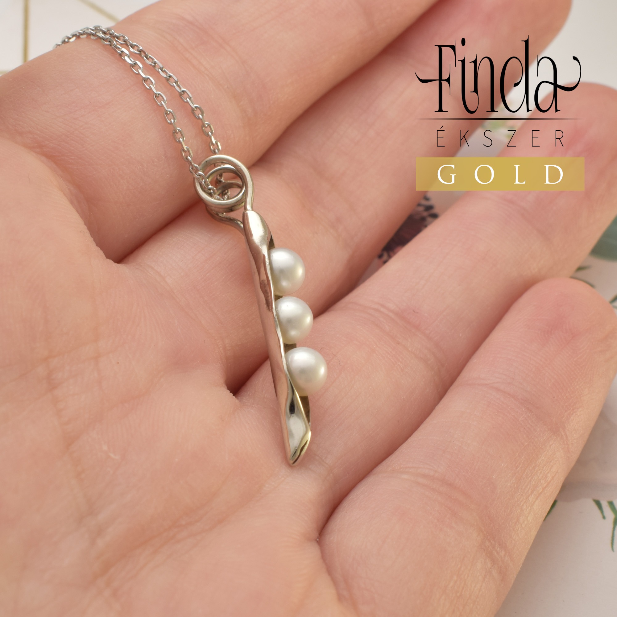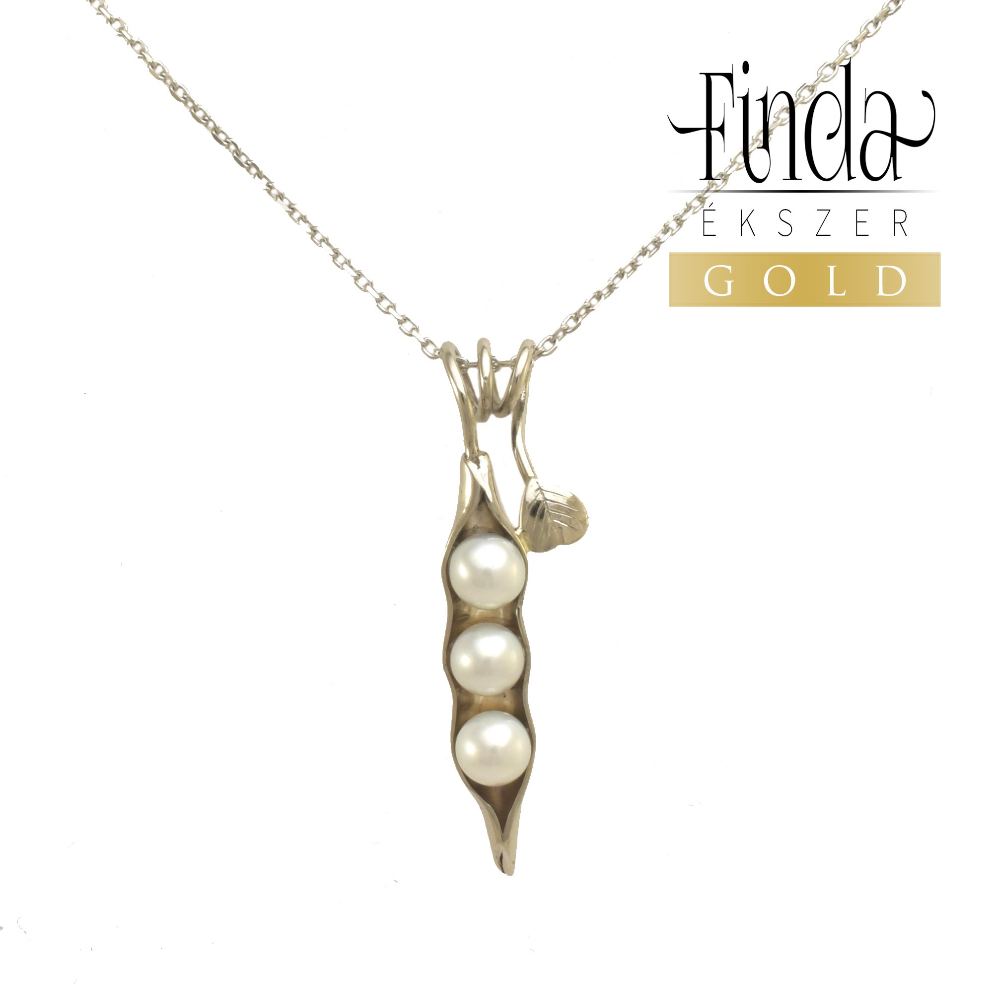 14 k fehérarany borsóhüvelyt formázó medál 3 db fehér tenyésztett gyönggyel, 45 cm hosszú láncon.