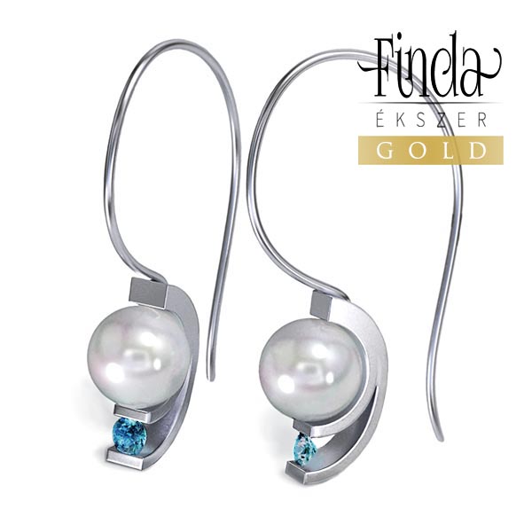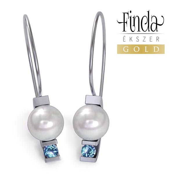Modern stílusú, elegáns tenyésztett gyöngyös fülbevaló 14 karátos fehér aranyból, kék topáz drágakövekkel . A megszokottnál hosszabb akasztórész miatt a fülbevaló hosszan lenyúlik a nyak felé. A kék topáz égkék színe harmóniát alkot a fehér arannyal és a fehér gyönggyel, ami vonzza a tekintetet.