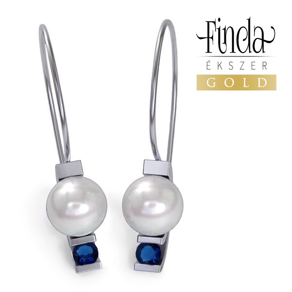 Modern stílusú, elegán ragyogó kék zafír fülbevaló 14 karátos fehér aranyból, fehér színű tenyésztett gyöngyökkel. A megszokottnál hosszabb akasztórész miatt a fülbevaló hosszan lenyúlik a nyak felé. A zafír karakteres kék színe szép kontrasztot képez a fehér arannyal és a fehér gyönggyel, ami vonzza a tekintetet.