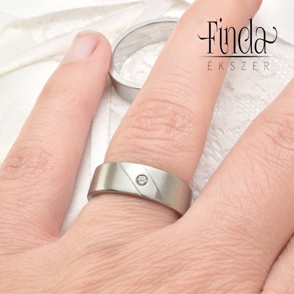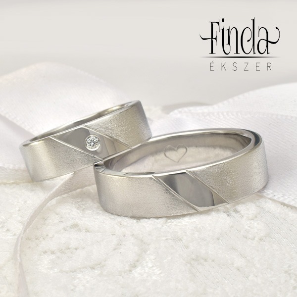 Lapos kialakítású nemesacél karikagyűrűpár matt és fényes felülettel. A női gyűrűben egy 2,0 mm átmérőjű gyémánt briliáns ragyog. A képen 6 mm széles gyűrűk szerepelnek. Belső részében egy-egy vésett szívminta. Tetszőleges belső vésés külön kérhető bele.