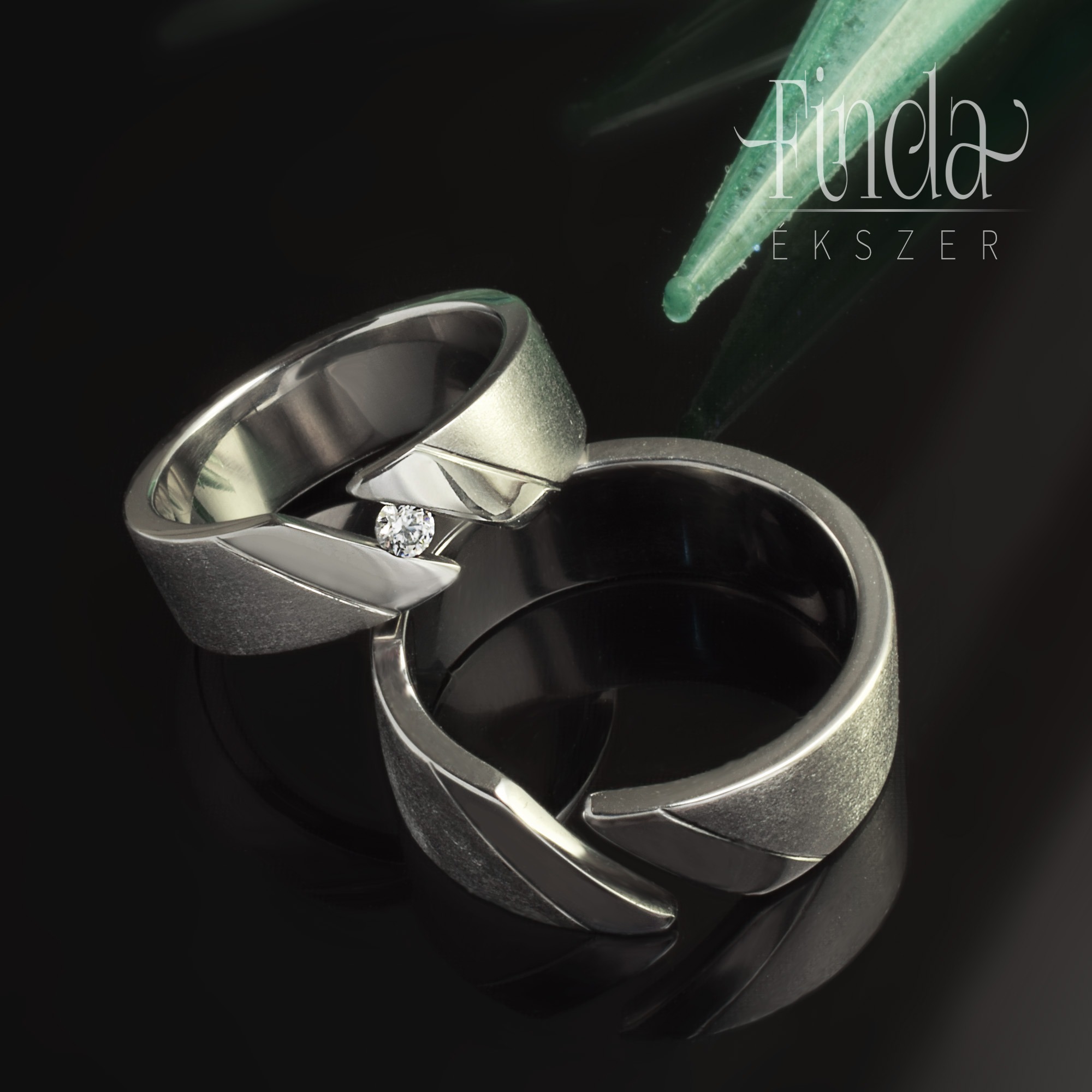 Erőteljes és vagány stílusú nemesacél gyűrű fehér gyémánttal. A gyűrű különlegessége, hogy a drágakő olyan hatást kelt, mintha lebegne. A 6 mm széles női gyűrűben egy 2,25 mm átmérőjű gyémánt briliáns ragyog. A férfi gyűrű 7 mm széles. A gyémántot ölelő keskeny sávok fényesre polírozottak, a gyűrű többi része mattított.