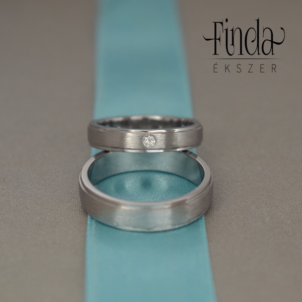 Letisztult, elegáns nemesacél jegygyűrűpár gyémánttal. A 4,5 mm széles női gyűrűben 1 db 2,25 mm átmérőjű fehér Top Wesselton, VS tisztaságú gyémánt ragyog. A férfi gyűrű 5,5 mm széles. A középső szálcsiszolt szalag enyhén kiemelkedik körben a gyűrű síkjából, ezt övezi két keskeny fényesre polírozott sáv.