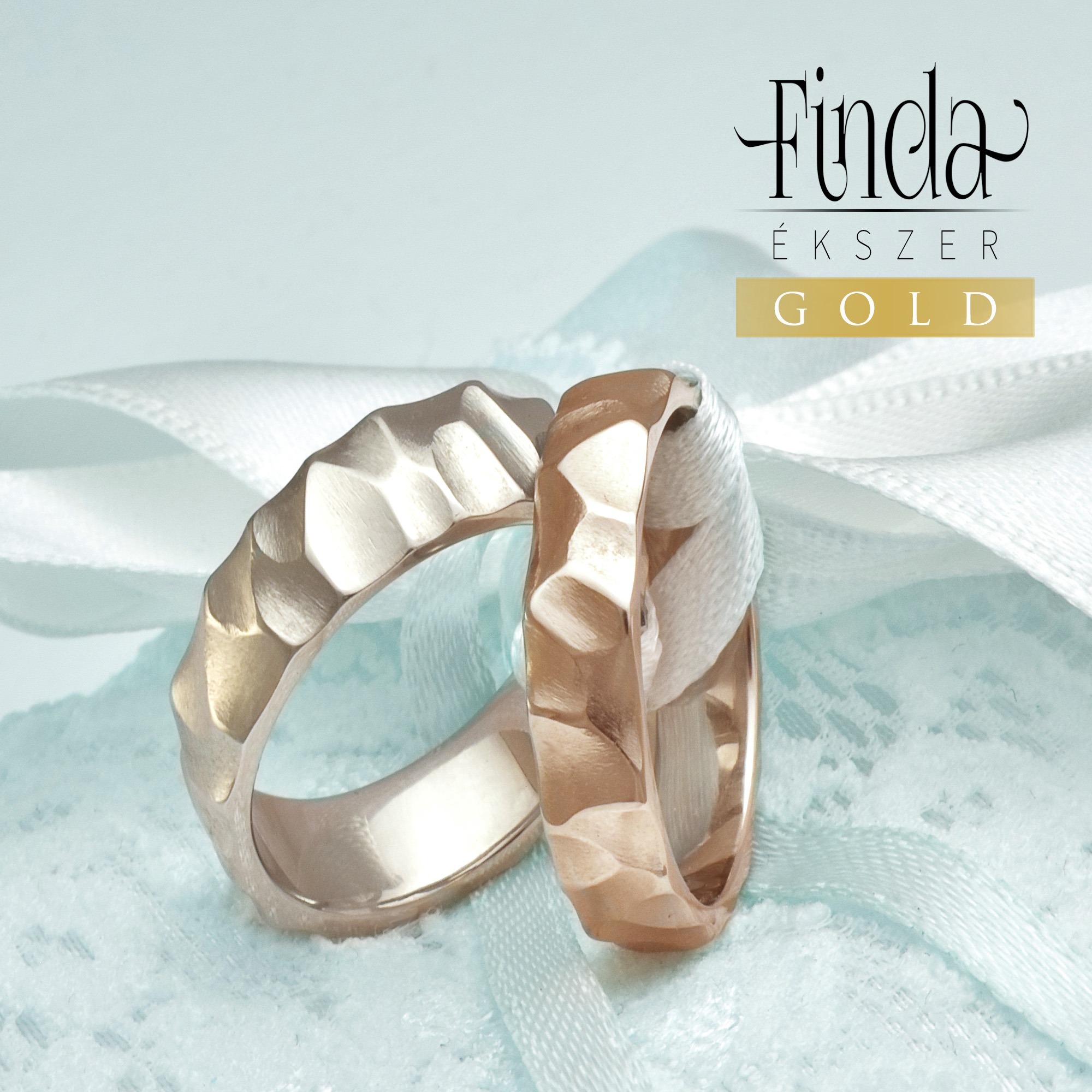 14 k rozé arany / rose gold és fehér arany jegygyűrűpár, melynek felülete akár a hullámzó folyóé. A női gyűrű a fotón 4 mm, a férfi 5 mm széles.