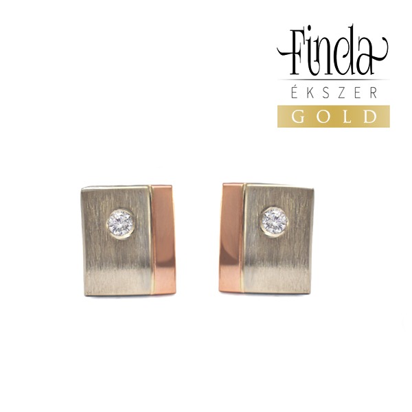 Modern stílusú, letisztult, elegáns, kétszínű 14 karátos aranyötvözetből készült gyémánt fülbevaló. A szélesebb fehér arany rész 6 mm széles, szálcsiszolt felületű, a 2 mm széles rozé arany fényesre polírozott.