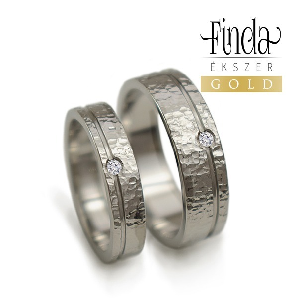 A férfi gyűrű 6 mm széles, a női gyűrű 4 mm széles, egy – egy 2 mm átmérőjű Top Wesselton VS gyémánt briliánssal.