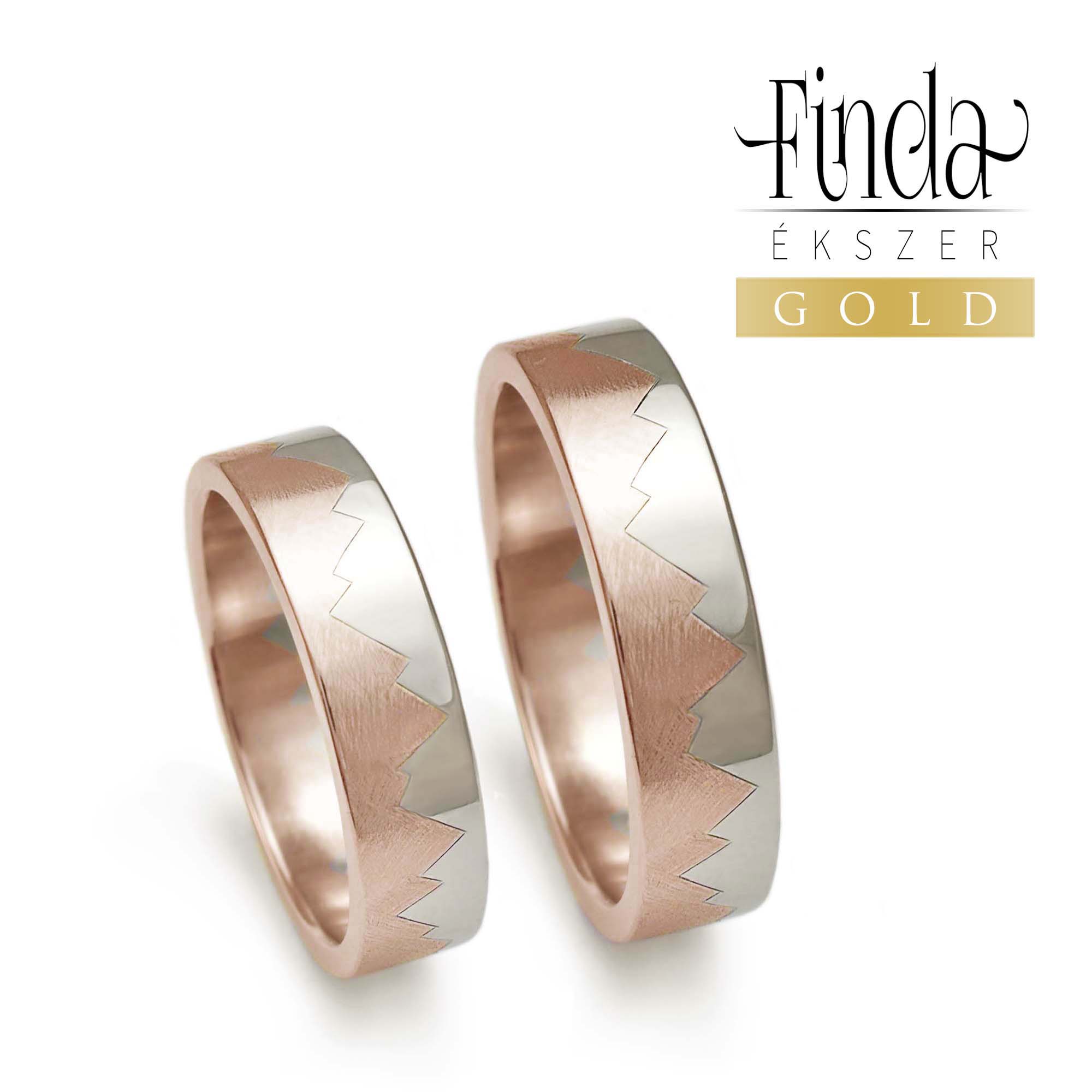 Kétszínű arany karikagyűrűpár hegyvonulatot idéző véstt mintával. A “hegy” karcos mintázatú, az “ég” fényesre polírozott. A mintázat teljes keresztmetszetében érvényesül az alapanyagban, nem csupán felületkezelés eredménye, így a szín NEM fog lekopni.