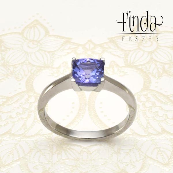 Kecses nemesacél eljegyzési gyűrű egy hangsúlyos de nem túlzóan nagy 6*6 mm párna csiszolású tanzanit drágakővel.