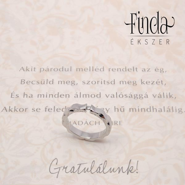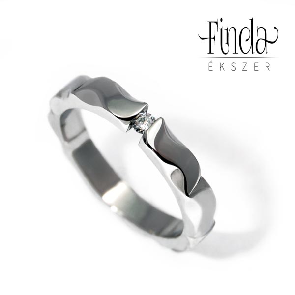 A gyűrű szélessége 3 mm, a női gyűrűben egy apró 2,25 mm átmérőjű fehér gyémánt briliáns ragyog.