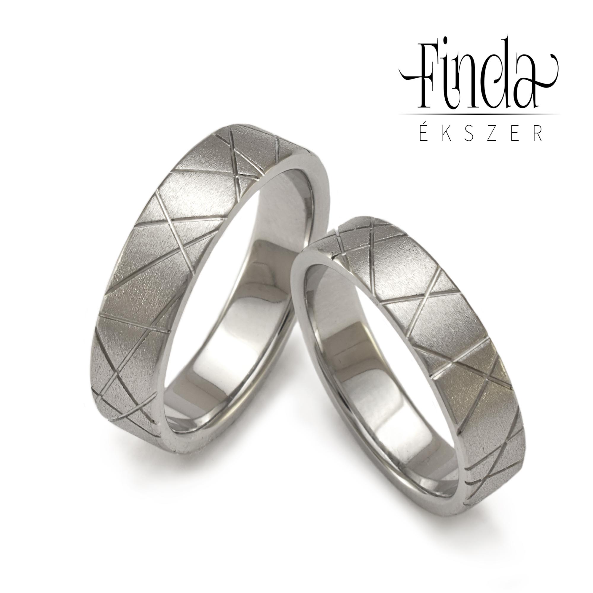 Lapos kialakítású nemesacél karikagyűrűpár véletlenszerűen egymást metsző egyenes vésett vonalakkal, matt felülettel.