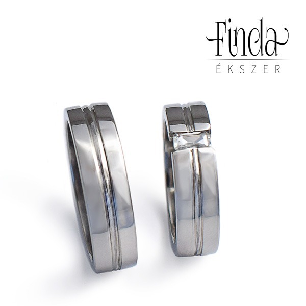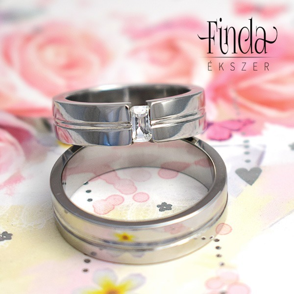 Lapos felületű nemesacél karikagyűrűpár két vékony párhuzamosan metszett hosszanti mintával, a női gyűrűben téglalap alakúra csiszolt fehér cirkón drágakővel. A karikagyűrűk felülete fényesre polírozott.