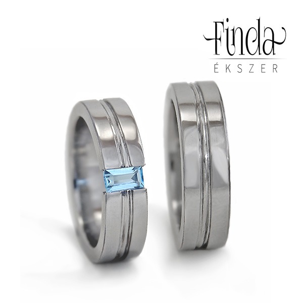 Lapos felületű nemesacél karikagyűrűpár két vékony párhuzamosan metszett hosszanti mintával, a női gyűrűben téglalap alakúra csiszolt kék topáz drágakővel. A karikagyűrűk felülete fényesre polírozott.