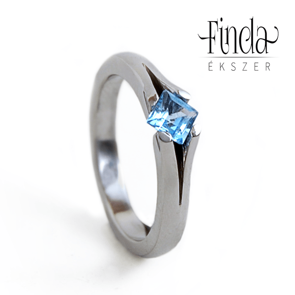 Nemesacél eljegyzési gyűrű négyzet csiszolású kék topázzal 4 karmos foglalatban.