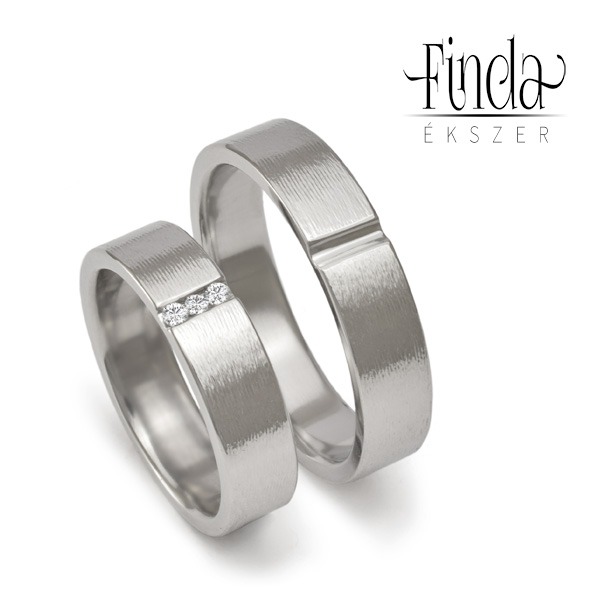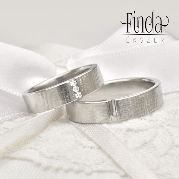 A fotón látható karikagyűrűk szélessége 5 mm, a női gyűrűben 3 db 1,5 mm átmérőjű fehér gyémánt ragyog egy sorban foglalva. A férfi gyűrű díszítő eleme egy fényes mélyített sáv, amely olyan széles mint a női gyűrűn a kősor szélessége.